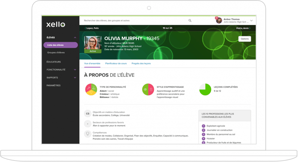 Avec un accès aux profils des élèves, les éducateurs obtiennent un aperçu des compétences et des intérêts des élèves de même que leurs activités dans Xello. En un coup d’œil, vous pourrez mieux comprendre qui sont vos élèves et quels sont leurs objectifs afin de rendre vos conversations plus constructives. De plus, les profils peuvent être partagés avec des parents pour assurer un meilleur soutien aux élèves.